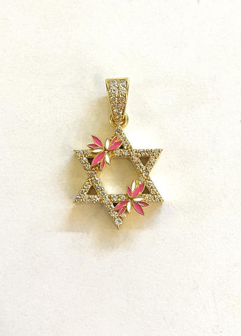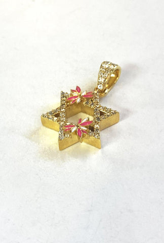 Custom Made Star of David 14k Gold Diamond and Pink Enamel Pendant
