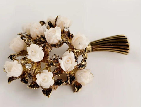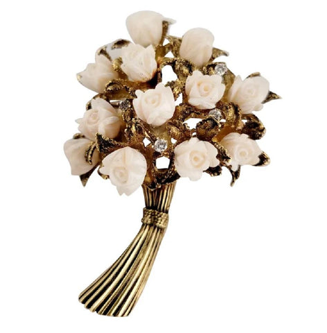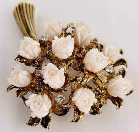 Antique Coral and Diamond Flower Shape Brooch in 14K Yellow Gold