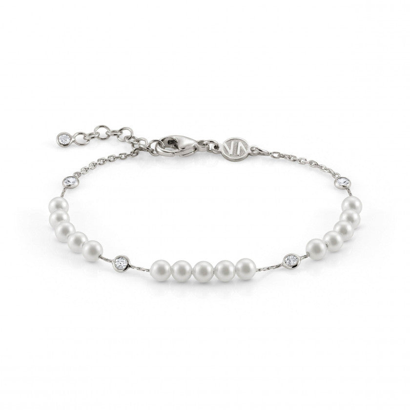 Bella Collection bracelet in sterling silver, white Cubic Zirconia and three strings of Swarovski Pearls. Available with either white or grey pearls. Length: 18,5 cm, shortens to 16,5 cm. Pearl diameter: 0,4 cm. Made in Italy. Elegant and delicate, this bracelet is sure to add a touch of class to your look.