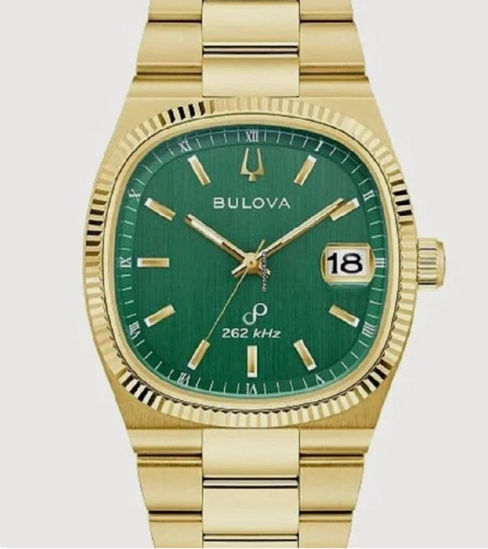 Drawing inspiration from the incredible Bulova Super Seville Day-Date of the 1970s, the men’s Bulova Super Seville merges retro aesthetics with state-of-the-art movement technology for timeless modern appeal. With versatility for every style, the gold-tone stainless steel 38mm case strikes a bold stance with a seamless silhouette created by the TV-shaped case transitioning into the matching integrated 3-link stainless steel bracelet, which features a push-button deployant clasp. An elegant, grooved coin edge bezel enhances the case and surrounds a flat sapphire crystal and its date magnifier. The compelling dial is a verdant vertical brushed green, with polished gold-tone hands and indices and a date situated perfectly at 3 o’clock. The new Bulova Super Seville is powered by our proprietary high-precision quartz Precisionist movement, a revolutionary 8-jewel quartz mechanism vibrating at a remarkable 262kHz, accurate to seconds per year with increased resistance to temperature changes, and with a smooth sweeping second hand. Embrace an effortless kind of elegance with the men’s Bulova Super Seville.