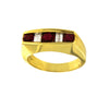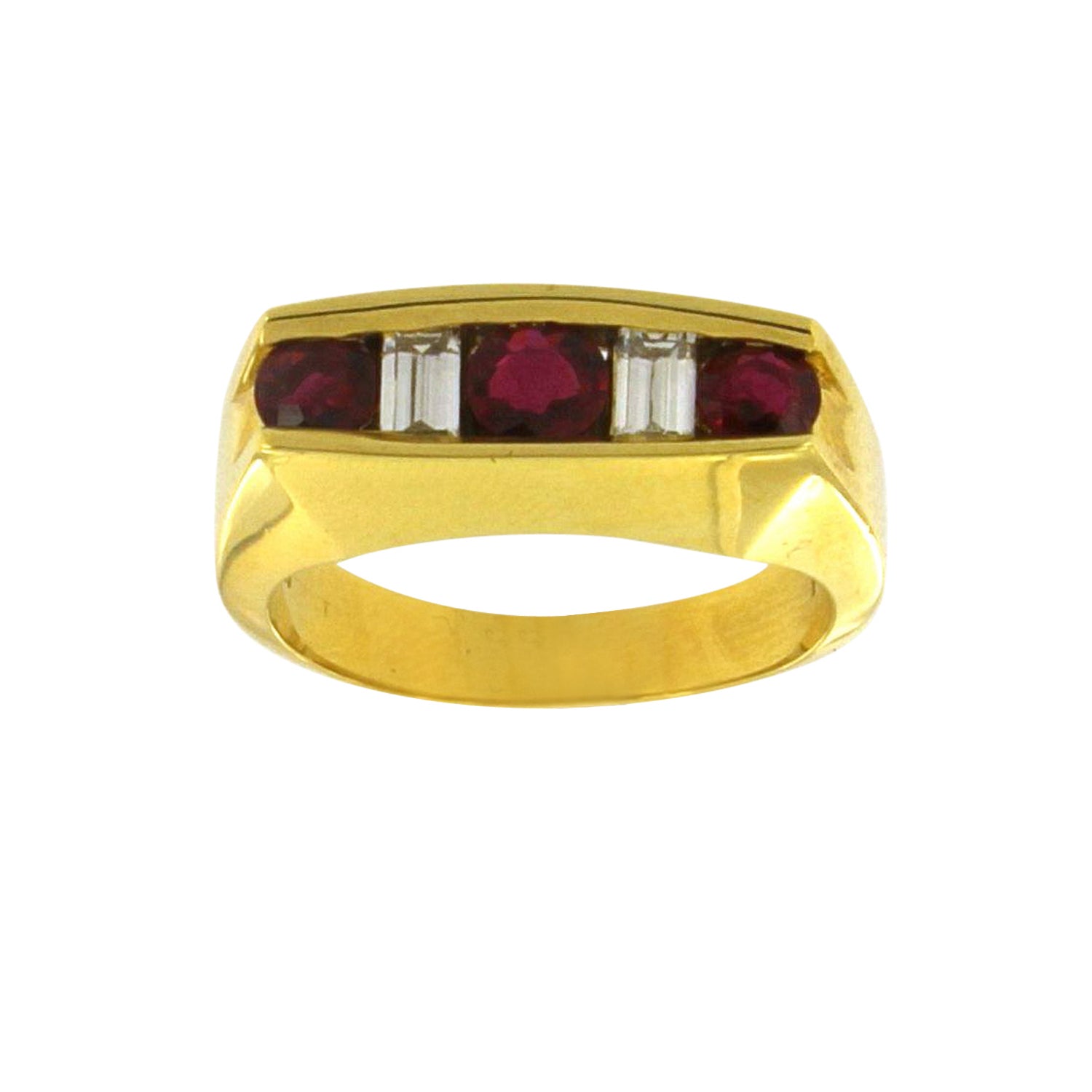 Burmese Ruby and White Diamond Men's Band in 18K Yellow Gold. The Diamonds are cut in emerald shape, in a total of 1.5carat weight for the two stones. The red ruby stones are cut in round shape and weight total of 1.65 carat. The ring is in size 10. We can adjust the size to your need.