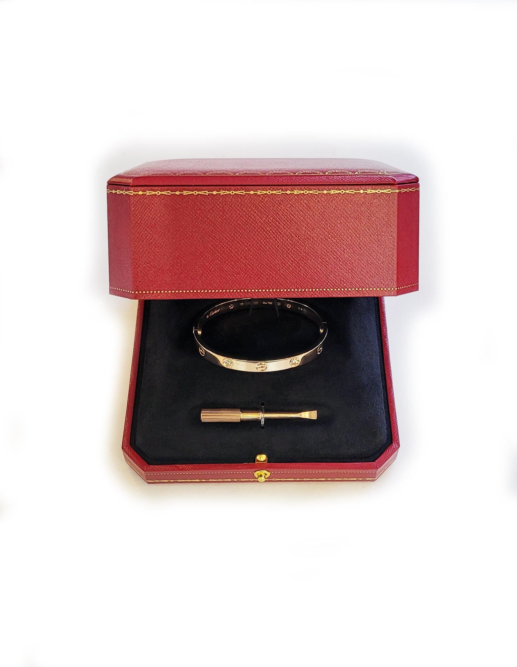 A Cartier icon since its creation in 1969, the LOVE bracelet locks with two functional screws and a screwdriver. The help of another person is required to put it on and take it off.