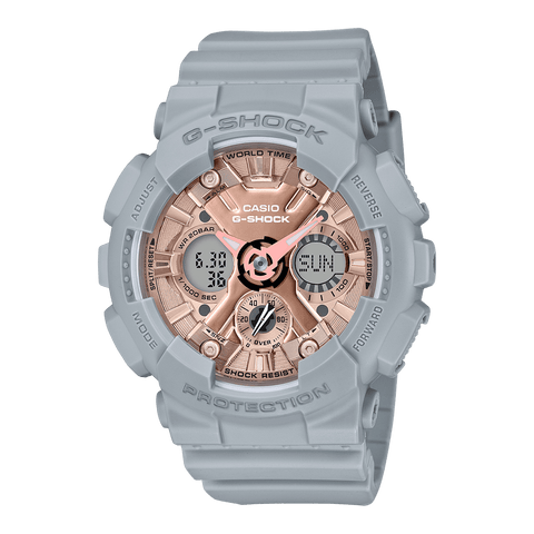 Casio Women's Quartz Watch - G-Shock Rose Gold Ana-Digi Dial Grey Strap | GMAS120MF-8A