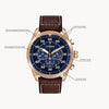 -Chronograph three sub-dials displaying: 60 second, 60 minute and 24 hours.
