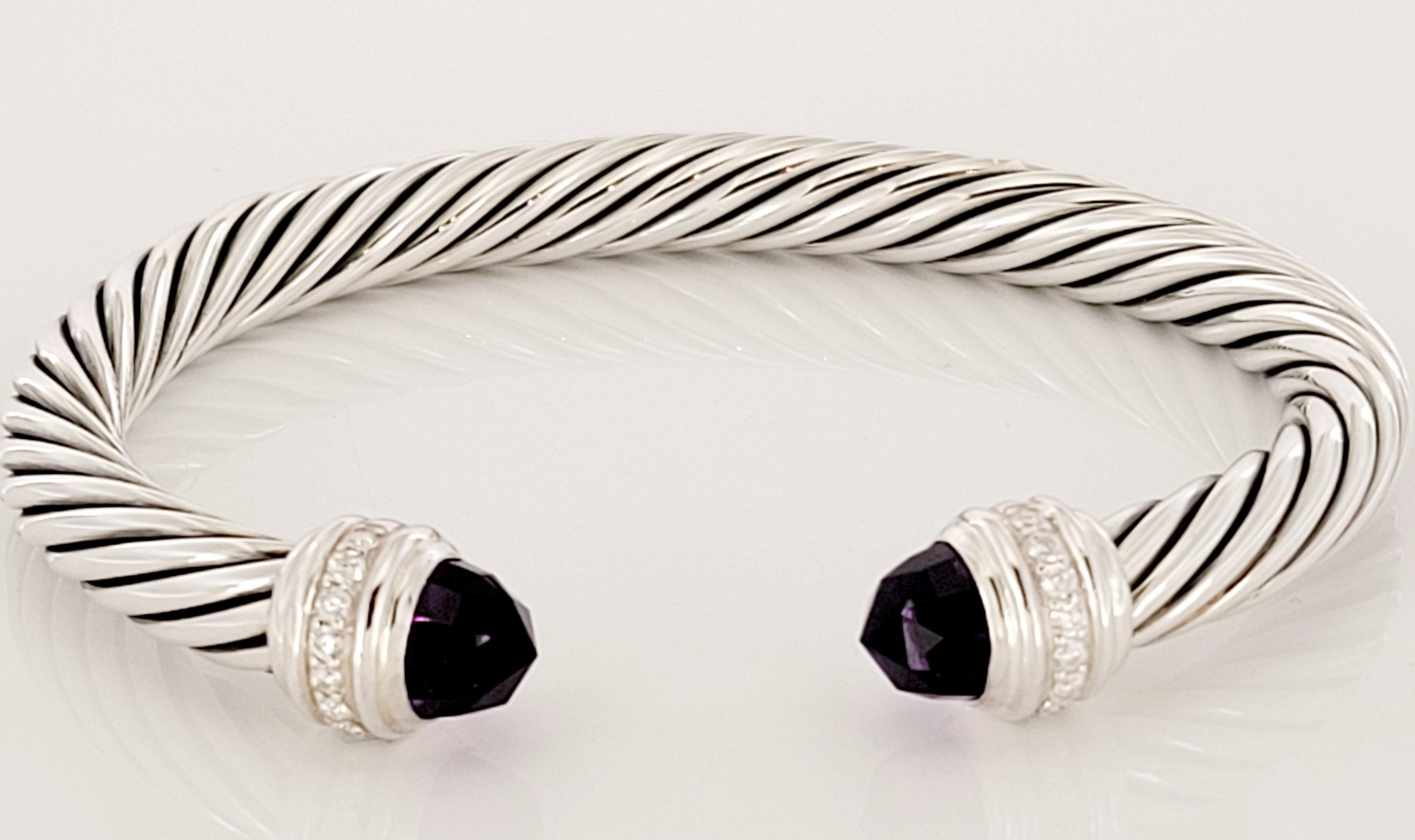 Classic Cable Bracelet Sterling Silver with Amethyst and Diamonds, 7mm