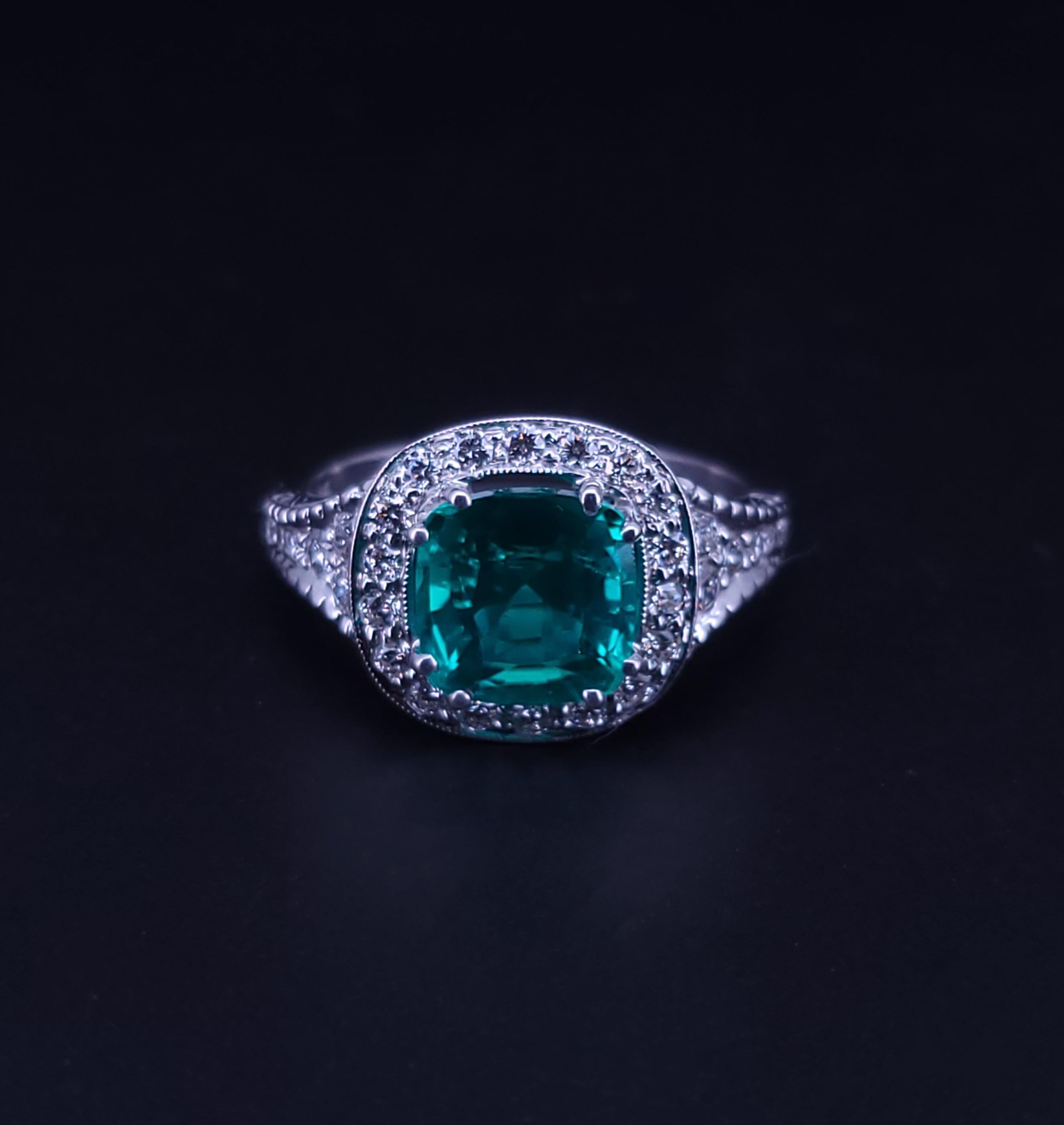 Cushion Cut Natural Emerald & Diamond Ring in 18K White Gold