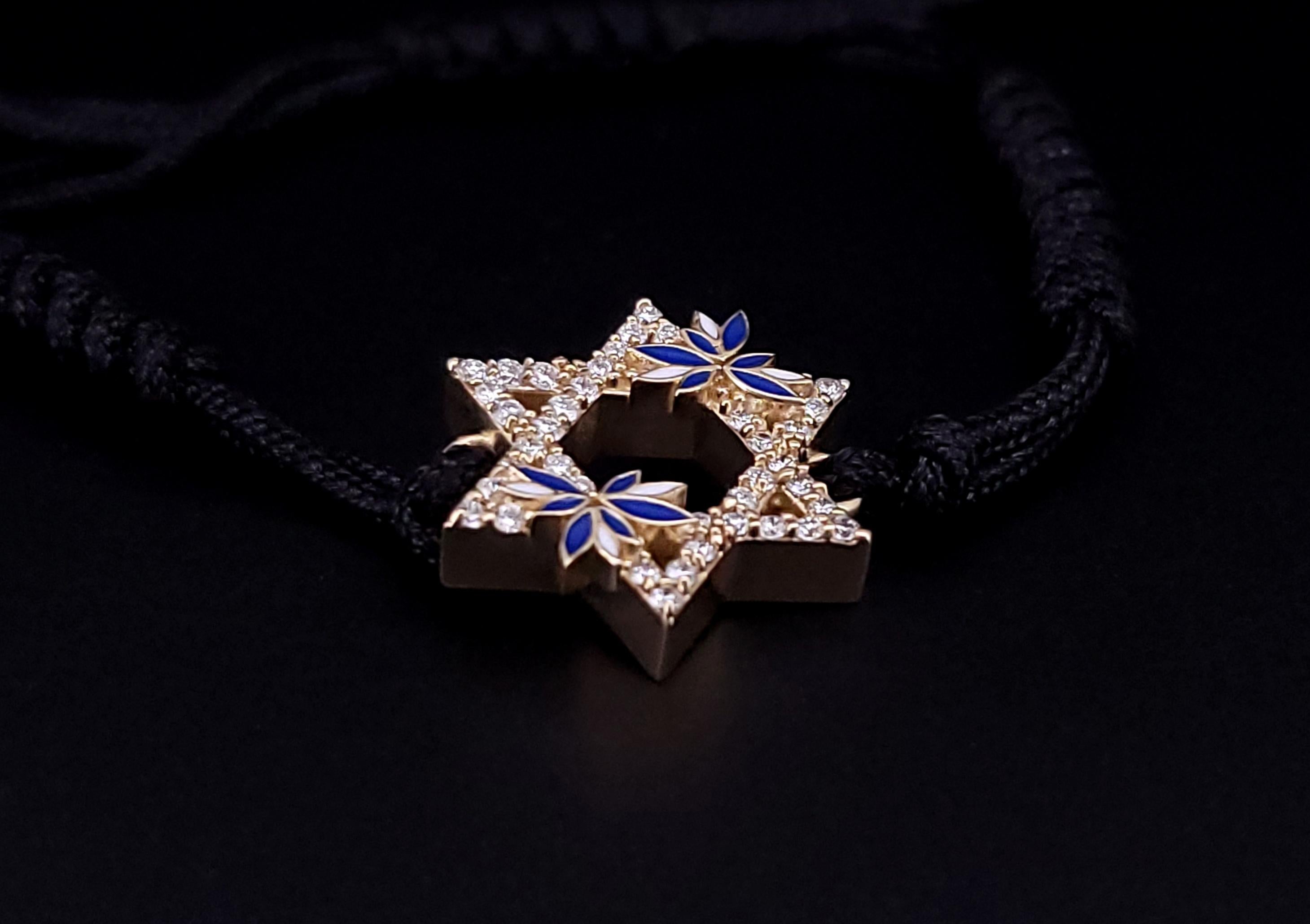 Custom Made Star of David 14k Gold Blue Enamel with Diamonds Black Bracelet