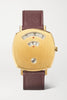 - Three Windows indicating the Hour, Minute and Date on a Gold dial