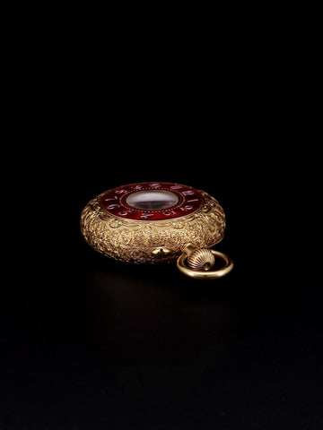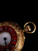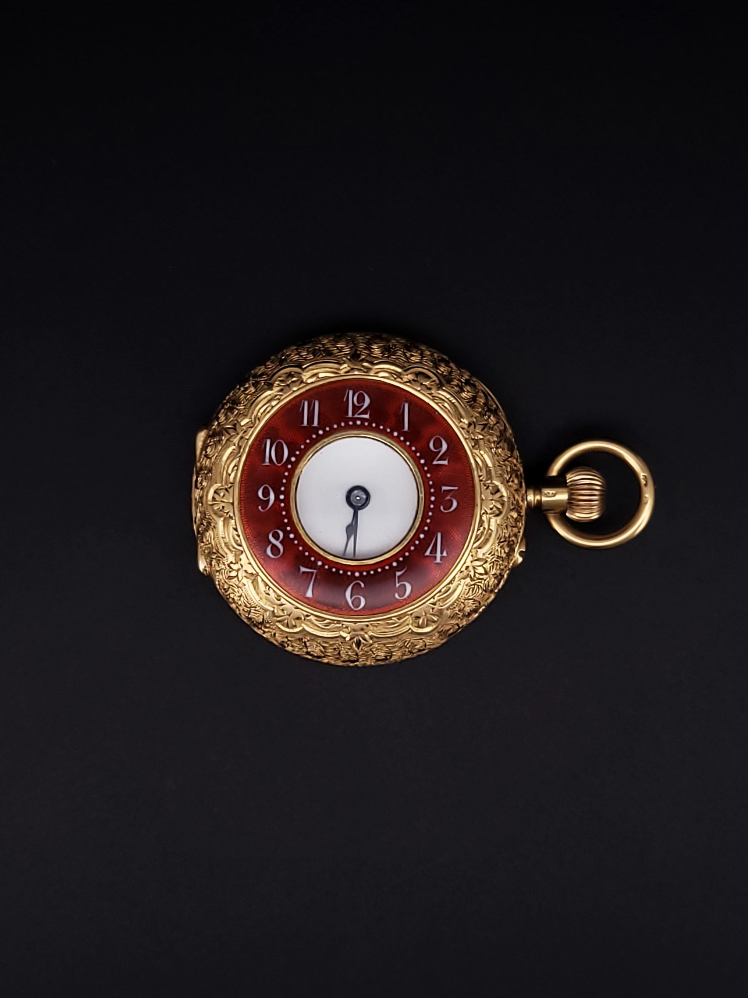 This is a vintage pocket watch in 18k yellow gold and red enamel, exclusively sold as one-of-a-kind.