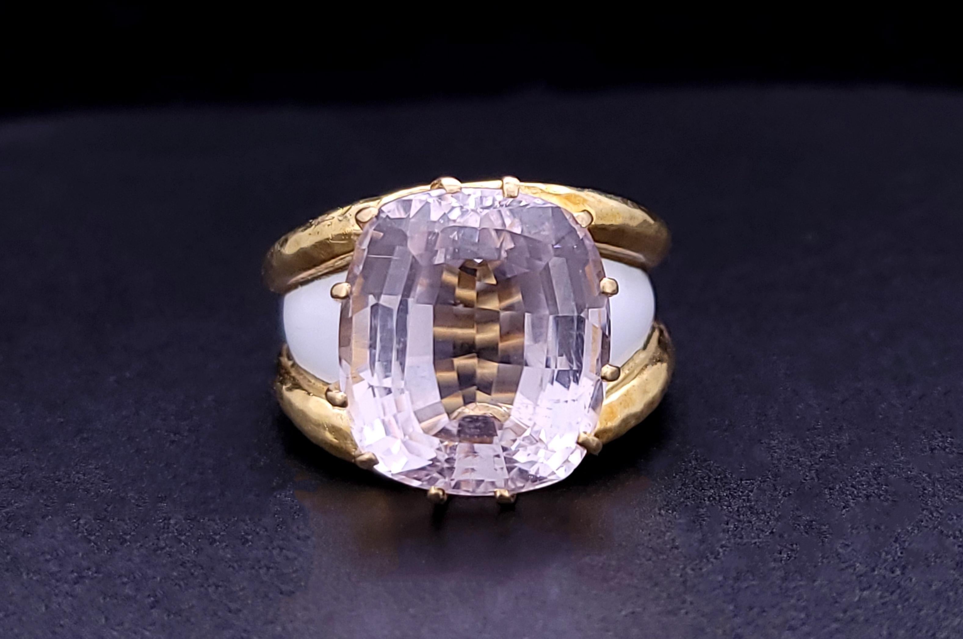 Kunzite Stone David Webb Ring in 18K Yellow Gold & White Enamel Size 9