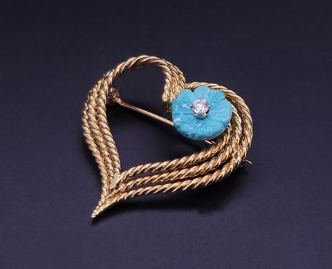 Tiffany & Co. Schlumberger 18k Gold Heart Brooch Turquoise Flower